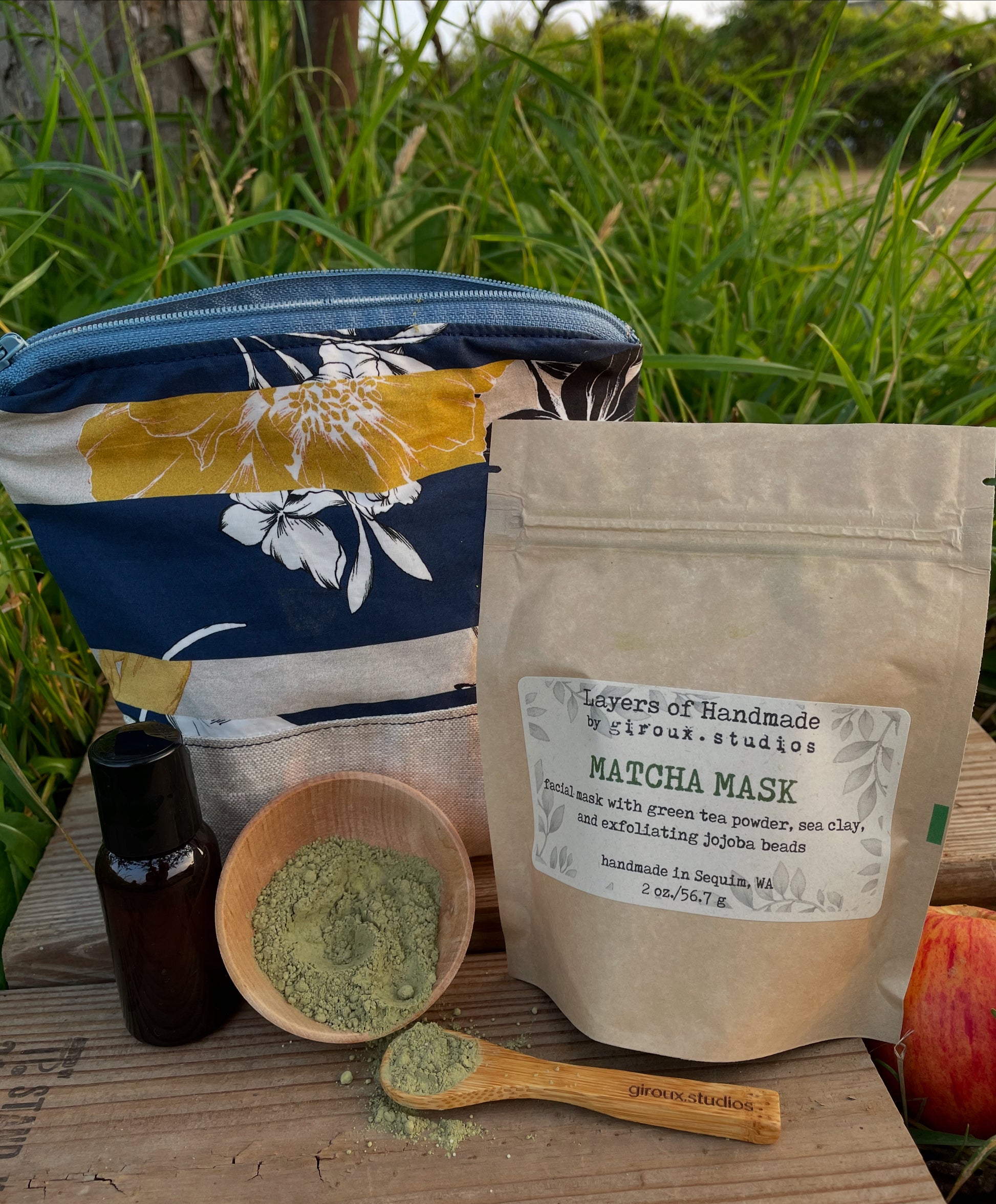 Designed with green tea powder, sea clay, and natural jojoba beads, this diy kit comes complete with a handmade ceramic bowl, wooden spoon, a wee bottle of hydrating glycerin, and enough dry ingredients for about 12-13 masks. All packaged in a hand-sewn cosmetics bag. The dry ingredients are stored in a resealable and fully home compostable pouch, just to be a little extra.